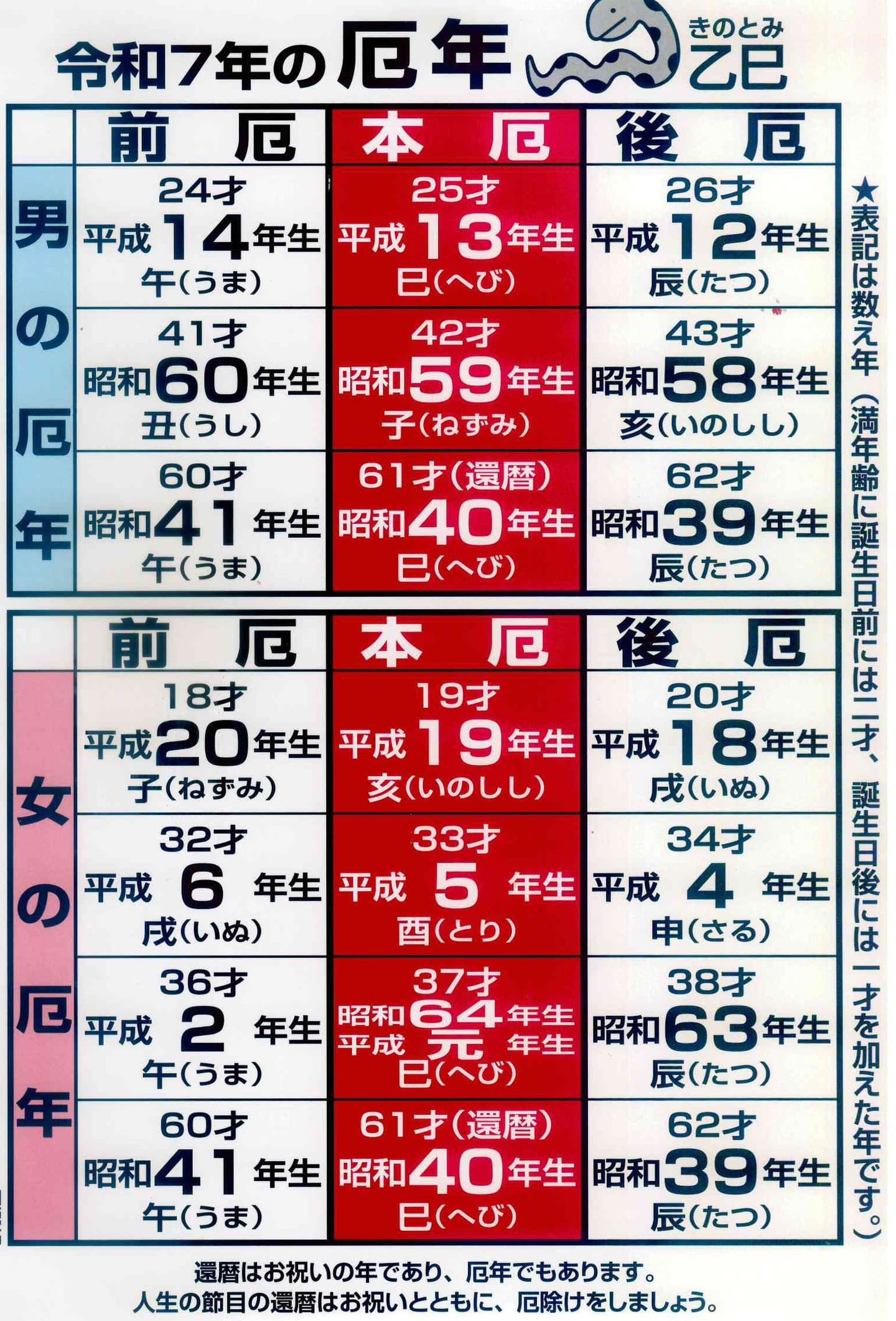厄年は、数え年で男性が25歳・42歳・61歳、女性が19歳・33歳・37歳の年で、その前後の年を前厄・後厄と呼んでいます。
